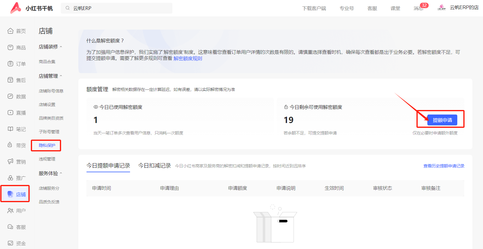 如您当日剩余可用解密额度不足,且有特殊情况需要提额,可在【千帆PC端-店铺-隐私保护】页面,发起【提额申请】,申请商家白名单则选择“不限额度”(白名单最长14天),申请当天临时提额则选择“限定额度”,平台会进行审批。详见《小红书消费者隐私信息加密公告》-解密额度管理相关说明;